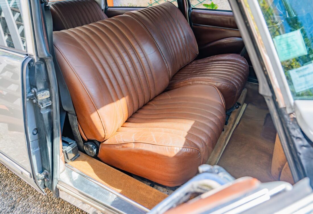 Cette DS 23 « M », reprend les codes du luxe de l’époque avec sa teinte gris métallisé pour son tour de caisse, mariée aux nombreuses pièces chromées et à un toit vinyle noir. L’habitacle, recouvert de cuir et moquettes de couleur tabac, affiche une très belle patine, qui confère une certaine âme à cette voiture. L’ensemble des équipements spécifiques à sa finition, que ce soient les enjoliveurs à flasque, les baguettes, les éléments de serrurerie plus travaillés, le volant monobranche, l’instrumentation Jaeger, les dragonnes de maintien, les pare-soleil plus épais, la pédale d’accélérateur « sport », ou encore les dessus de porte en cuir et tous les chromes présentent bien.