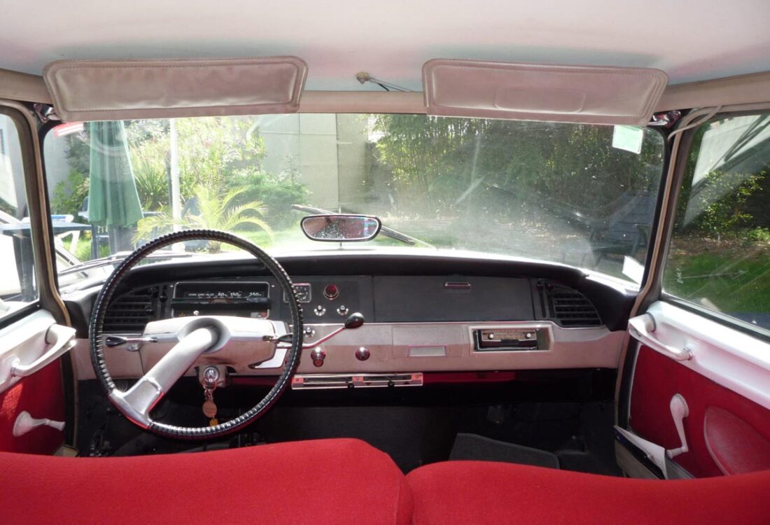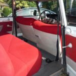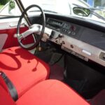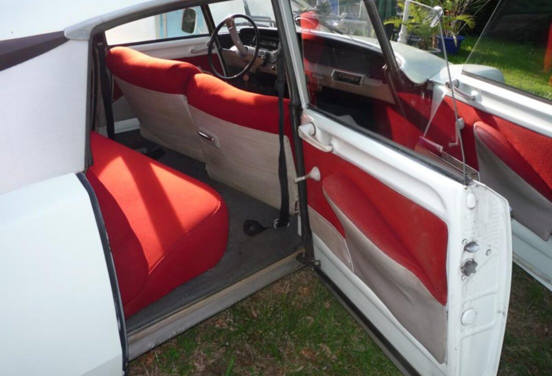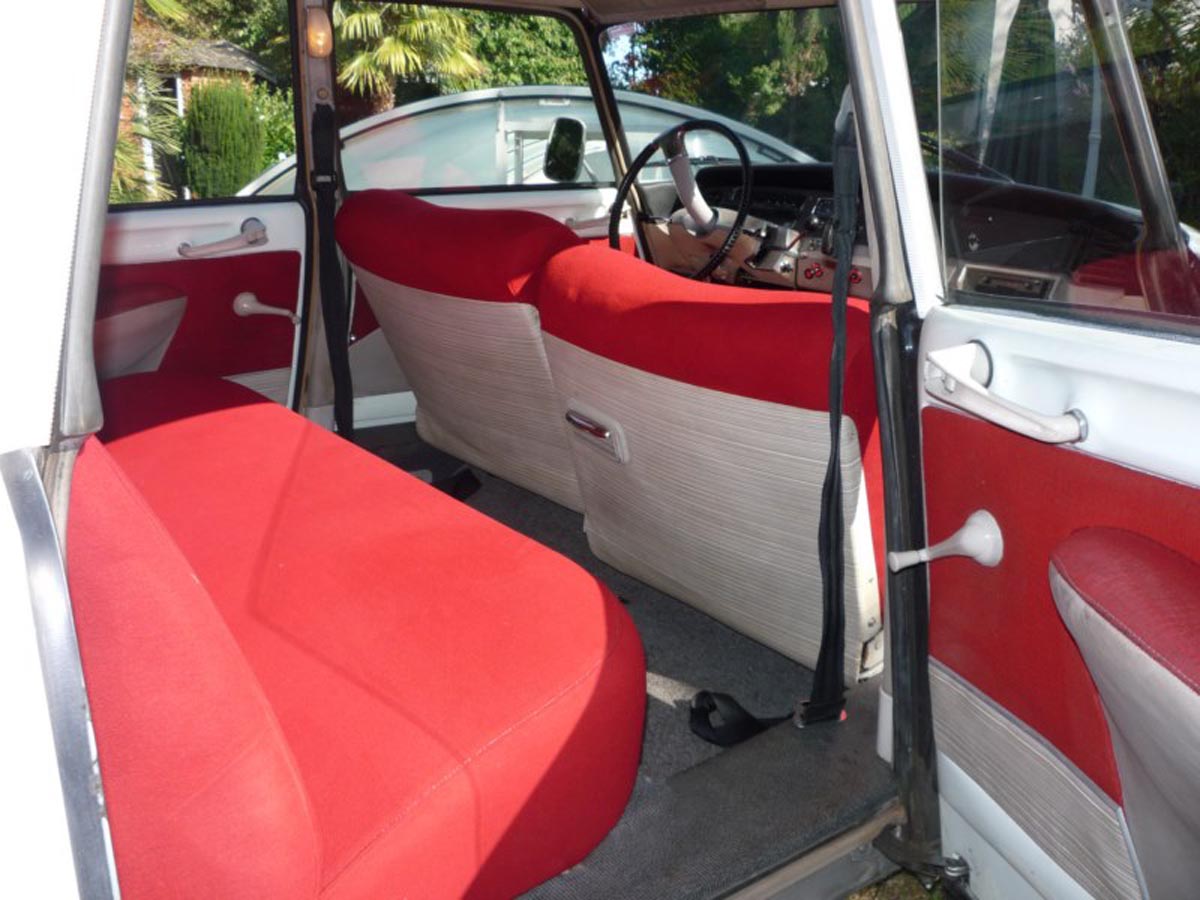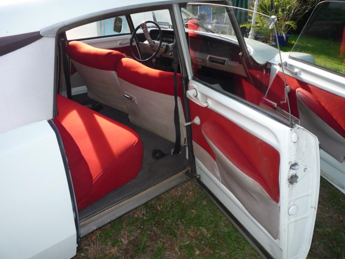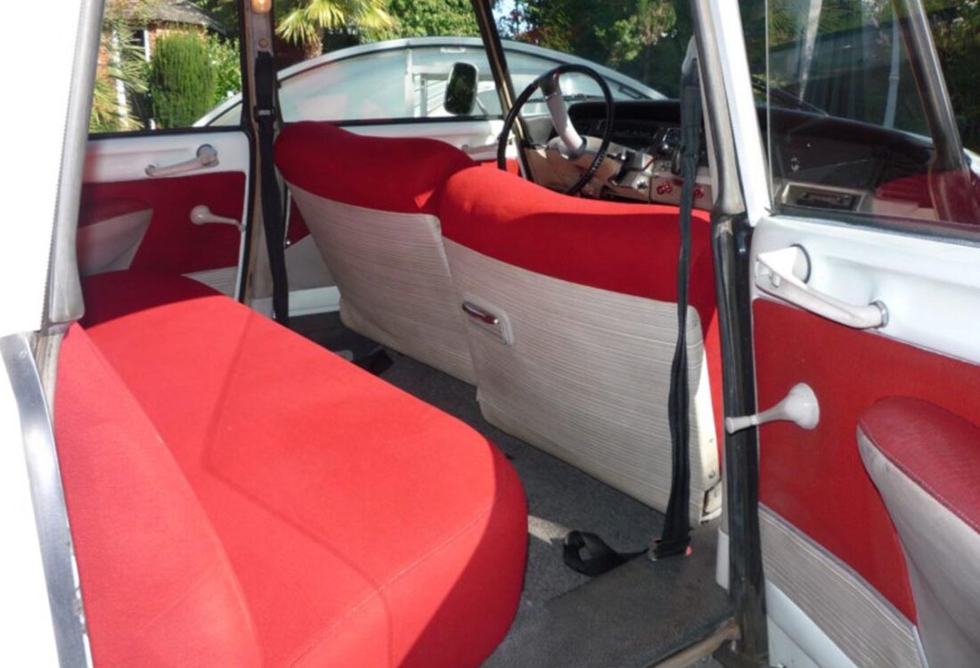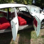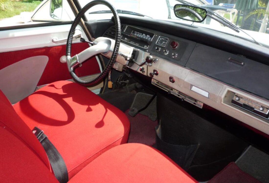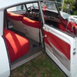 Couleur blanc carrare (peinture refaite) avec sellerie velours rouge d’origine en parfait état.