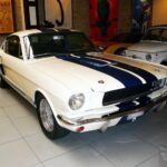 Le modèle présenté ici est de 1966, blanche avec bandes lemans bleues et jantes cragar