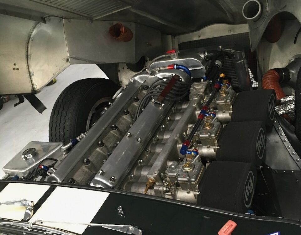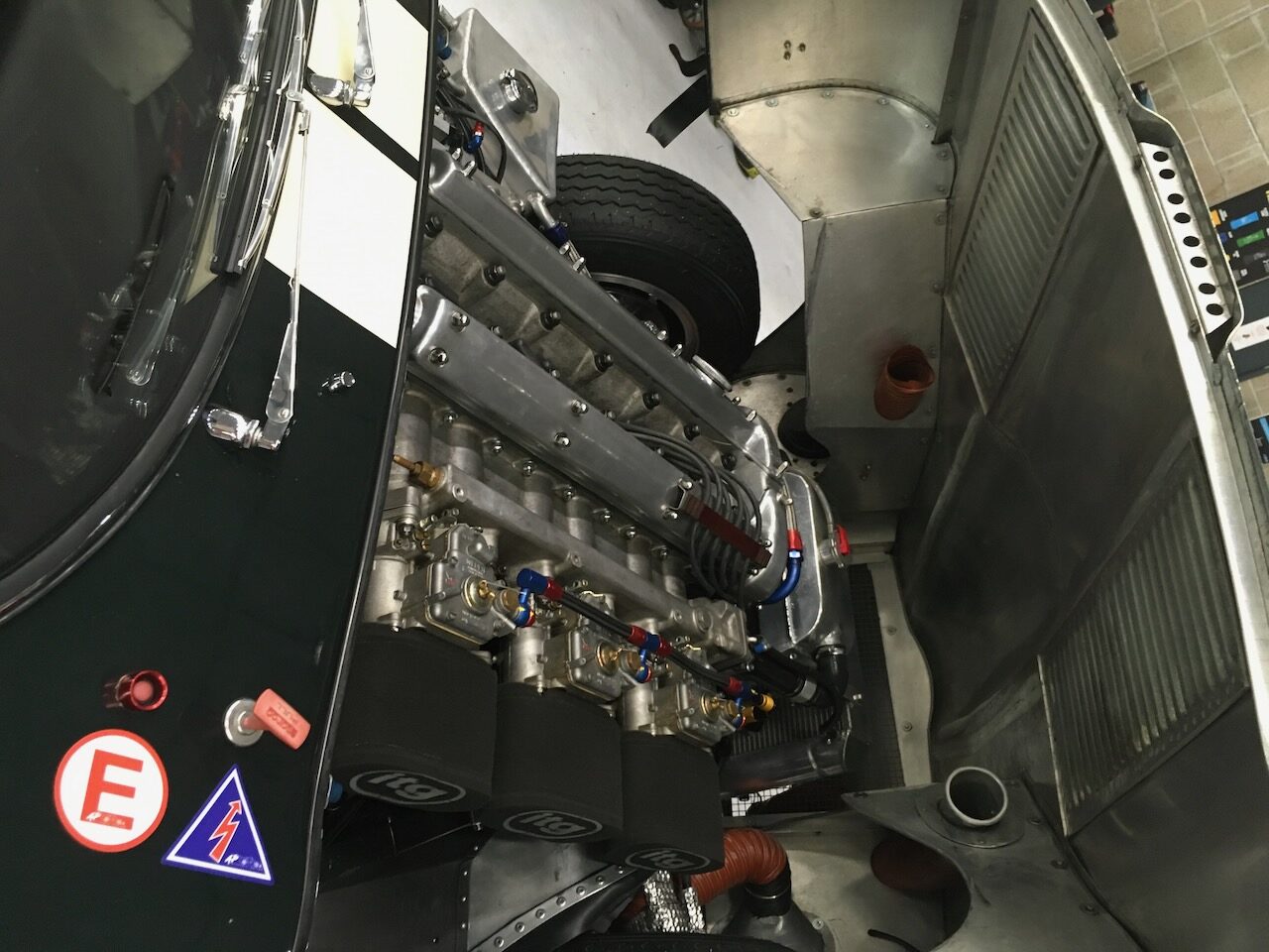 Moteur 3.8 litre block fonte avec culasse aluminium straight port. Volant moteur allégé. Bielles longues et pistons JE Rob Beere. Carburateurs Weber 45 DCOE. Pompes à essence FACET. Echappement inox avec collecteurs FIA. Puissance 297 chevaux au banc.