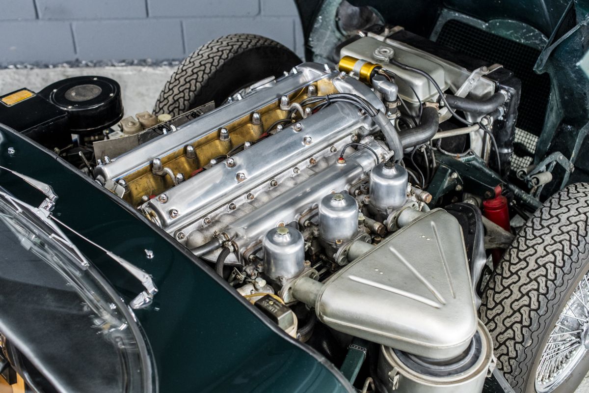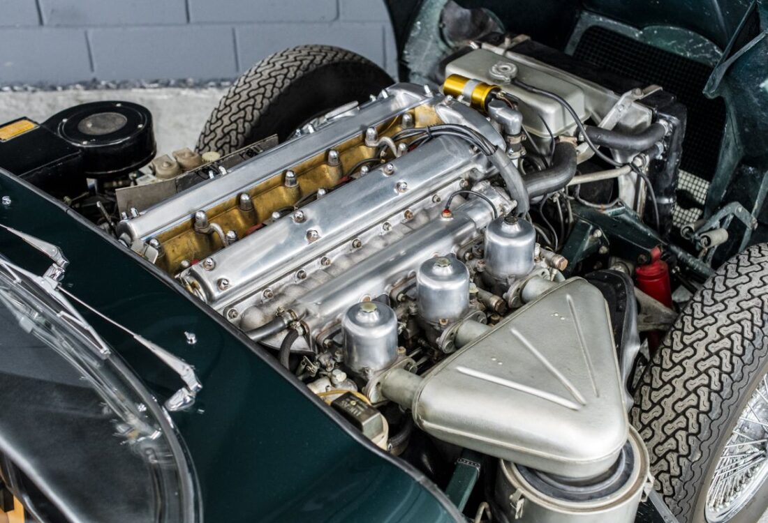 Coiffé de la culasse « straight port » en aluminium et nourri par trois carburateurs SU HD 8, il permet à la Type E d’atteindre le cap magique des 150 miles, soit 240 km/h.