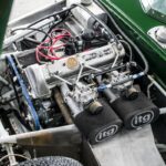 Le fondateur de Lotus, Colin Chapman, a formé une équipe de volontaires pour ‘aider à créer un modèle révolutionnaire pour 1956. Alors que les Lotus Marks 8, 9 et 10 de production étaient basées sur la Lotus Mark 6, la Eleven a été conçue à partir de zéro. Son plus proche ancêtre était la voiture de course d’usine Mk 9 du Mans, immatriculée XPE 6, un banc d’essai pour ce qui allait suivre. La Eleven utilisait un châssis en tubes d’acier avec des panneaux en aluminium. L’élégant châssis pesait moins de 30 kg. Il est propulsé par le nouveau moteur Coventry-Climax à quatre cylindres en aluminium, une conception à arbre à cames en tête avec un rapport poids/puissance impressionnant. Des freins à disque Girling étaient utilisés, et des pièces adaptées de toutes sortes de voitures anglaises de l’époque composaient le reste de la machine. Le véhicule était recouvert d’une étonnante carrosserie aérodynamique conçue par Frank Costin : fabriquée à la main en aluminium et articulée aux deux extrémités pour un accès facilité.