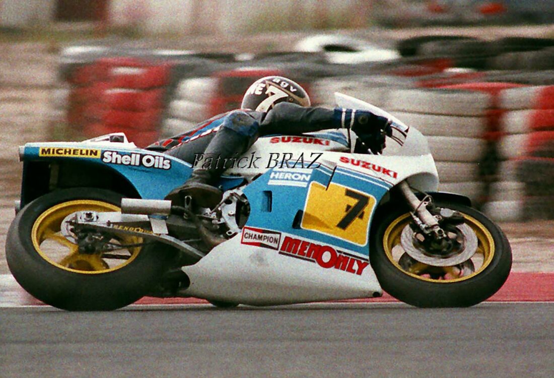 De rouge, blanc et jaune vêtue, la Suzuk’ frappée du n°7 est la plus victorieuse. Sheene remporte le titre ainsi que six des dix course de l’année.