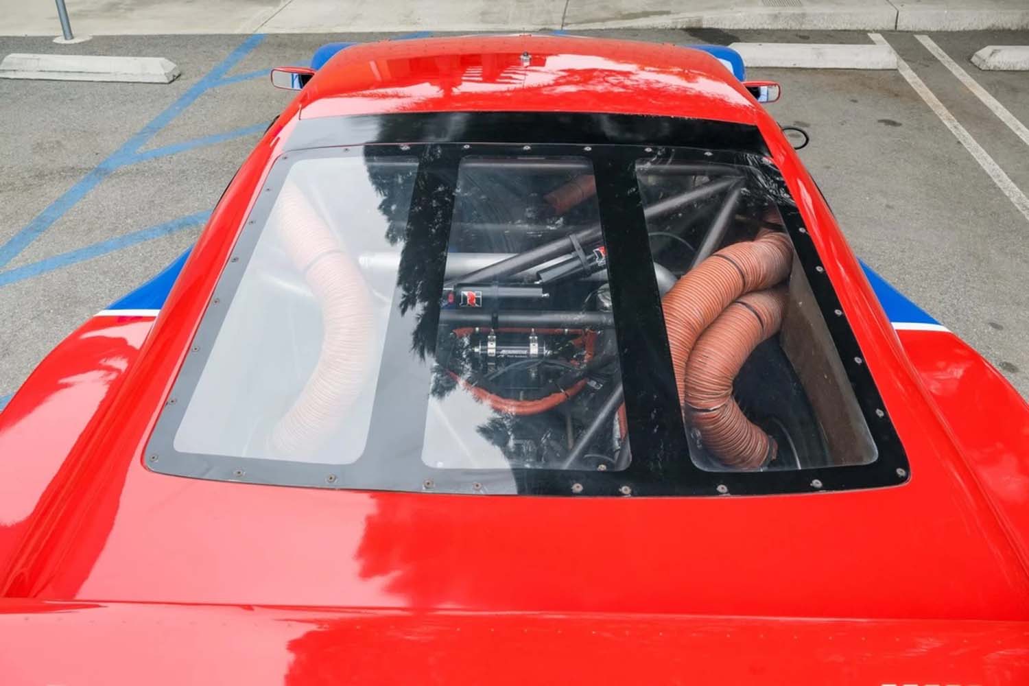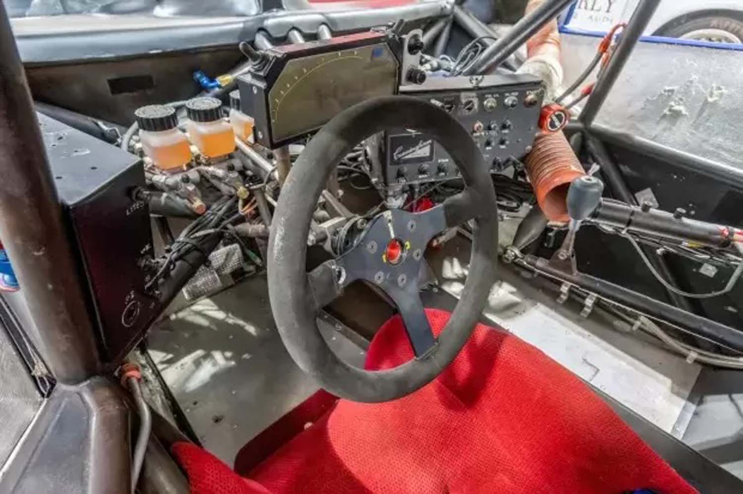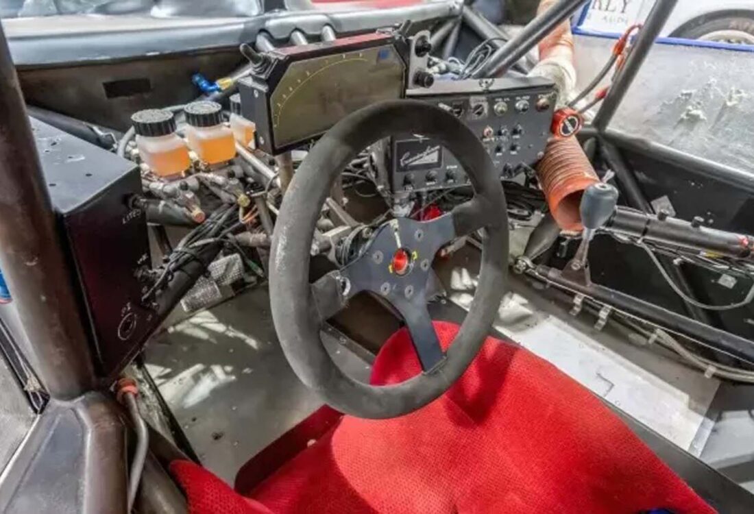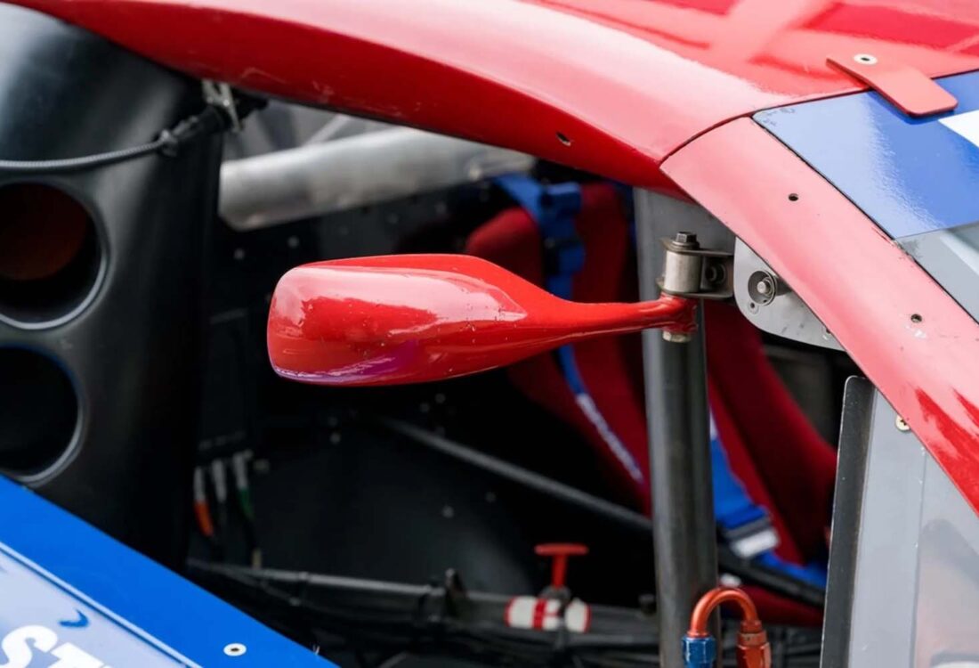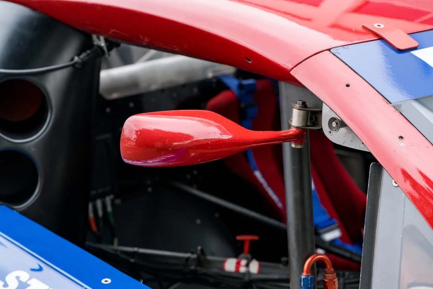 Power is provided by a front-mid-mounted 4.5-liter VH45DE V8 that features electronic fuel injection, coil-on-plug ignition, individual throttle bodies, and dry-sump lubrication. Additional equipment includes carbon-fiber composite bodywork over a long-wheelbase chromoly tube chassis, a Hewland VGC five-speed manual transaxle, adjustable coilover suspension, cross-drilled and ventilated disc brakes, staggered-width 17” BBS wheels, and a single racing seat upholstered in red.