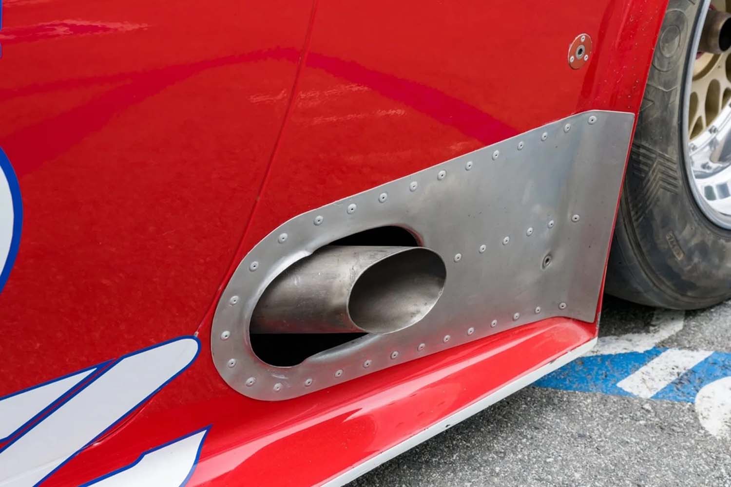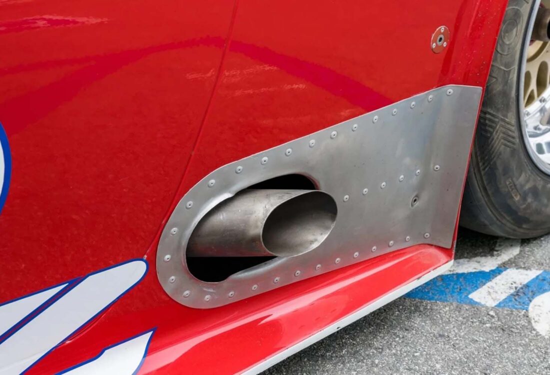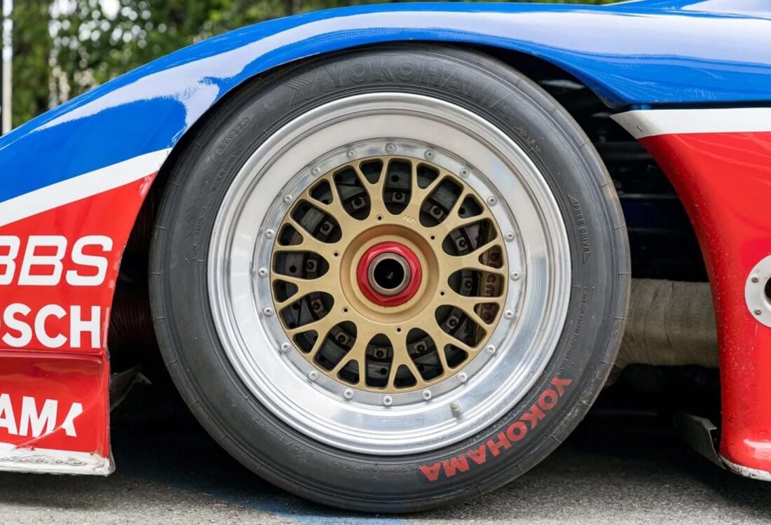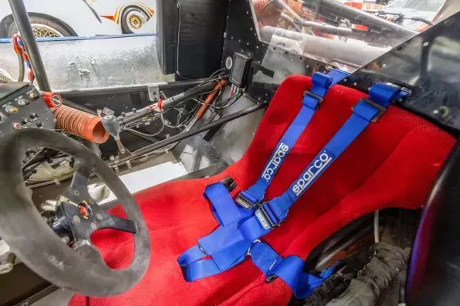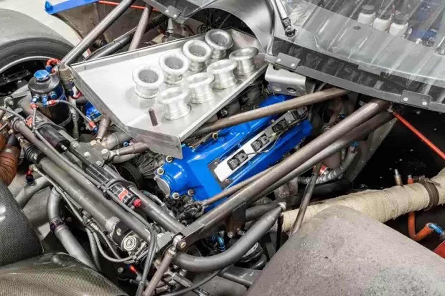 Power is provided by a front-mid-mounted 4.5-liter VH45DE V8 that features electronic fuel injection, coil-on-plug ignition, individual throttle bodies, and dry-sump lubrication. Additional equipment includes carbon-fiber composite bodywork over a long-wheelbase chromoly tube chassis, a Hewland VGC five-speed manual transaxle, adjustable coilover suspension, cross-drilled and ventilated disc brakes, staggered-width 17” BBS wheels, and a single racing seat upholstered in red.