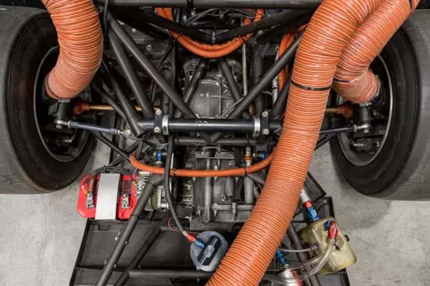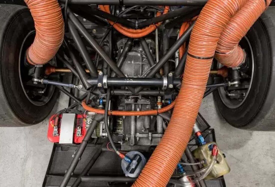 Elle est propulsée par un V8 VH45DE de 4,5 litres en position centrale avant, doté d’une injection électronique, d’un allumage par bobine individuelle, de papillons d’admission individuels et d’une lubrification par carter sec. L’équipement supplémentaire comprend une carrosserie en composite de fibre de carbone sur un châssis tubulaire en chromoly à empattement long, une boîte-pont manuelle Hewland VGC à cinq vitesses, une suspension à ressorts hélicoïdaux réglable, des freins à disque perforés et ventilés, des roues BBS de 17 pouces à largeur décalée et un siège de course unique recouvert de tissu rouge.