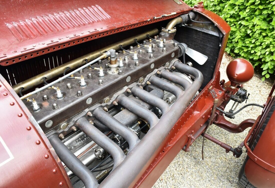 Conduire cette bête est une expérience inoubliable. L’énorme moteur à huit cylindres en ligne produit un son fantastique (comparable à un avion de chasse d’avant-guerre !), car il n’a qu’un seul petit silencieux. Le moteur a été dynamisé à 110 ch après la reconstruction, ce qui en fait une voiture plutôt rapide pour son âge. La peinture et le cuir sont magnifiquement patinés, tout comme l’intérieur et le compartiment moteur de la voiture. On dirait vraiment qu’elle est toujours dans sa peinture d’origine et qu’elle sort tout droit d’une grange, mais elle est en fait entièrement restaurée.