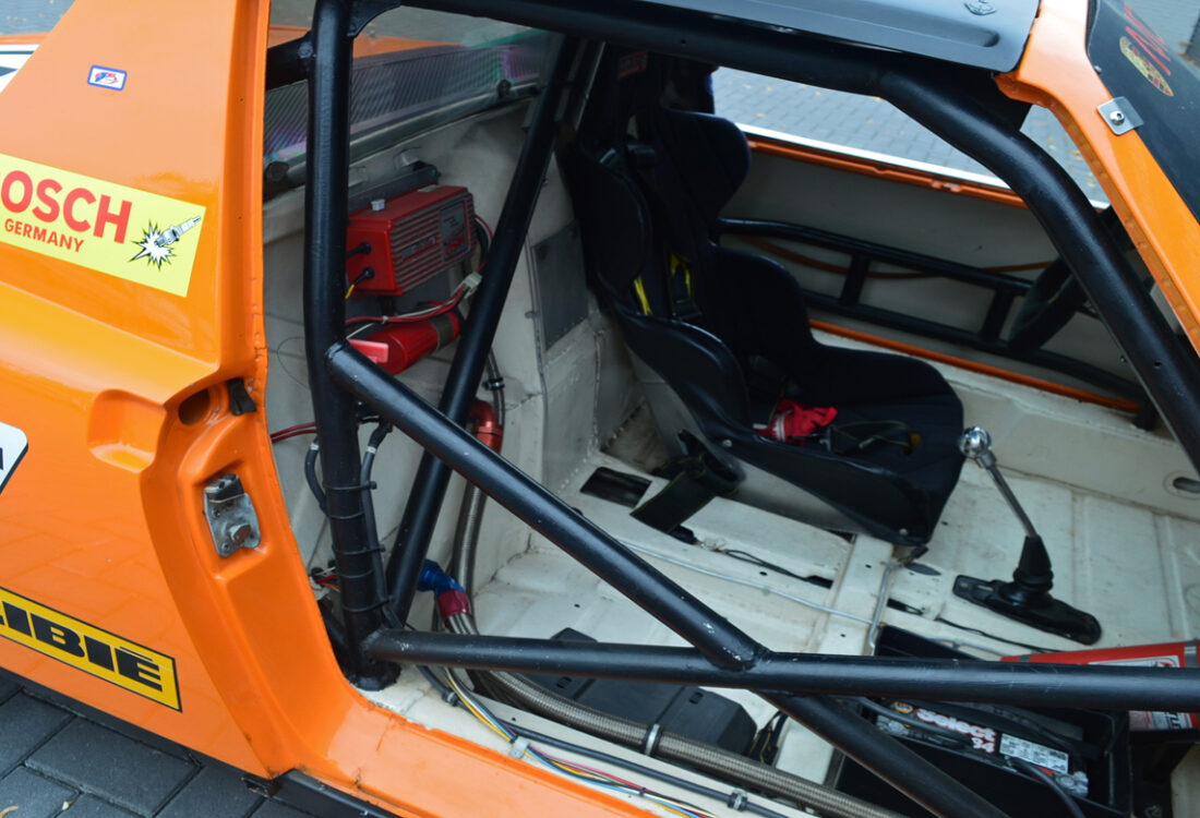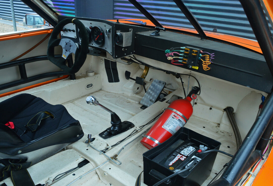 Caisse démontée et renforcée, arceau cache en acier. Les bras tirés arrière sont renforcés. Elle est équipée d’amortisseurs Koni réglables avec des ressorts Bilstein de type RSR. Barre stabilisatrice réglable. Pédalier réglable Tilton suspendu, étriers Willwood à 4 pistons sur tous 4 roues. Jantes 7×15 Fuchs à l’avant et 9×15 Minilites à l’arrière.
