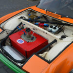 Chassis: stripped and reinforced, tied-in with steel roll cage. Rear trailing arms reinforced, Koni adjustable coil overs installed. RSR type Bilstein coil overs, 1″ sway bar with adjustable arms and drop links. braking handled by Dual hanging Tilton set up with balance bar, Willwood 4-piston Calipers on all corners. Running (as in period) on 7×15 Fuchs up front and 9×15 Minilites in the rear.