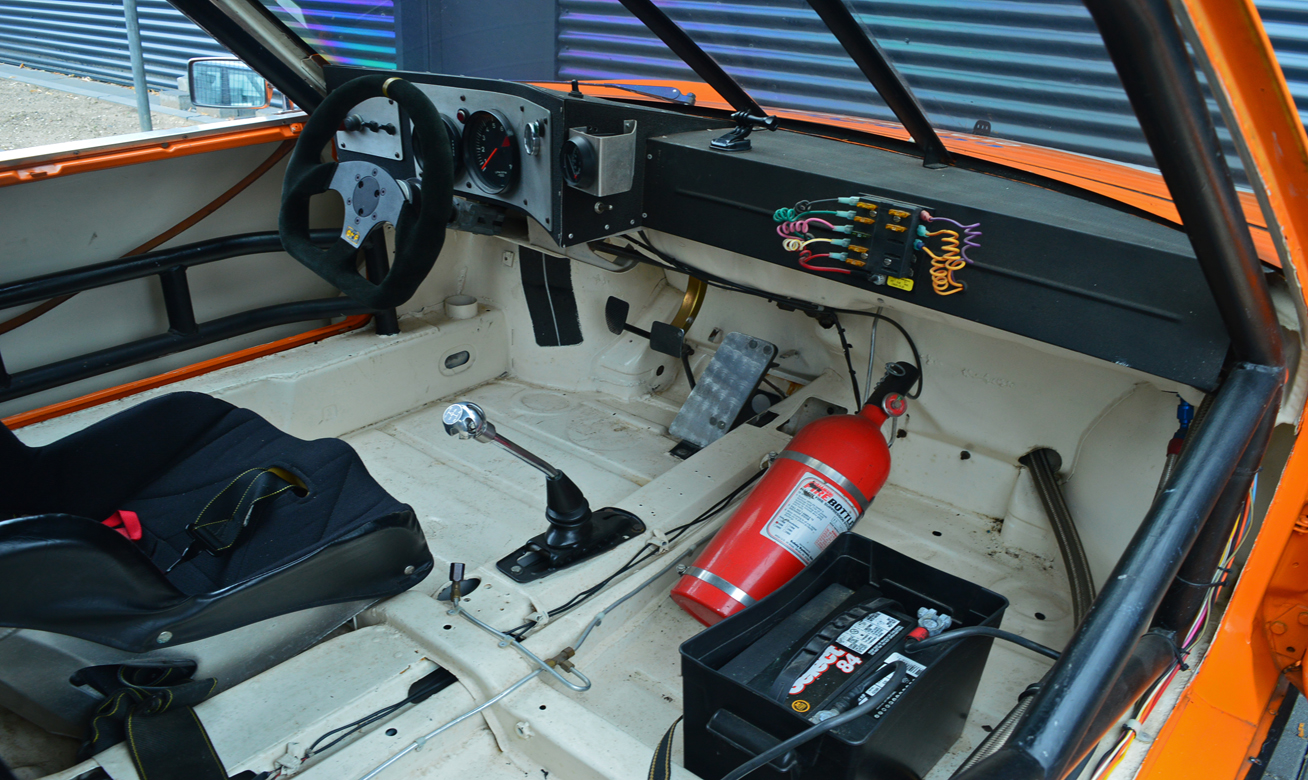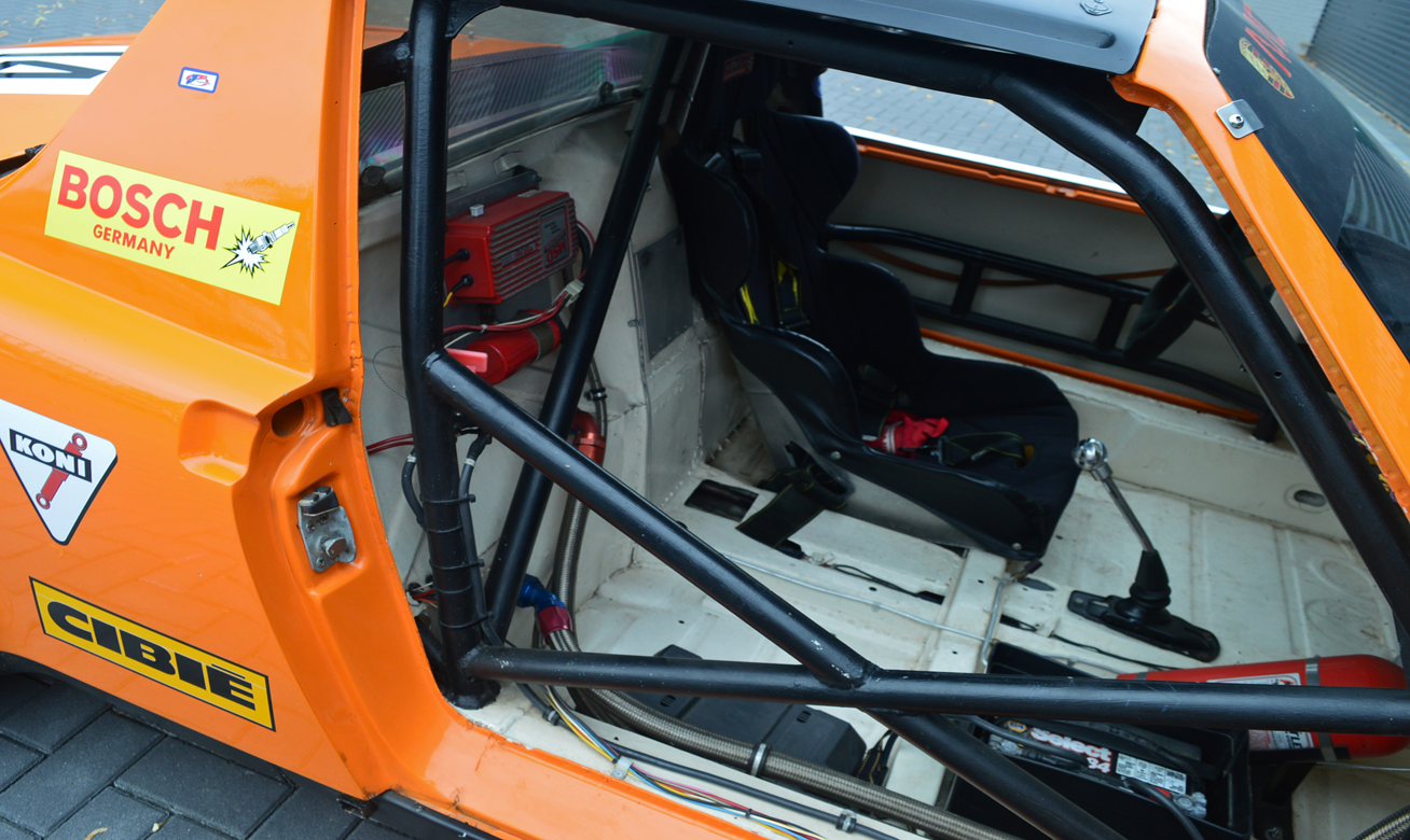 Caisse démontée et renforcée, arceau cache en acier. Les bras tirés arrière sont renforcés. Elle est équipée d’amortisseurs Koni réglables avec des ressorts Bilstein de type RSR. Barre stabilisatrice réglable. Pédalier réglable Tilton suspendu, étriers Willwood à 4 pistons sur tous 4 roues. Jantes 7×15 Fuchs à l’avant et 9×15 Minilites à l’arrière.